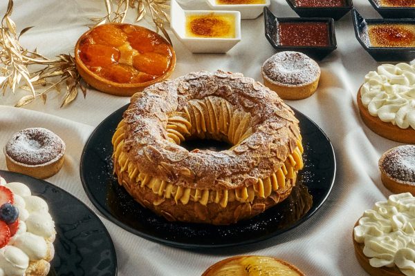 今回のスイーツビュッフェでは、濃厚でとろけるようなチョコスイーツを中心に、秋に大好評をいただきましたタルトを、冬仕様にアレンジしてご用意しました。なかでも注目は、フランスの伝統菓子「パリブレスト」。リング状に焼き上げたシュー生地に、香ばしく焙煎したアーモンドやヘーゼルナッツが香るクリームをたっぷりとサンドした、ヒルトン横浜オリジナルの一品です。