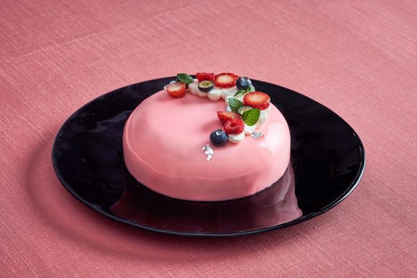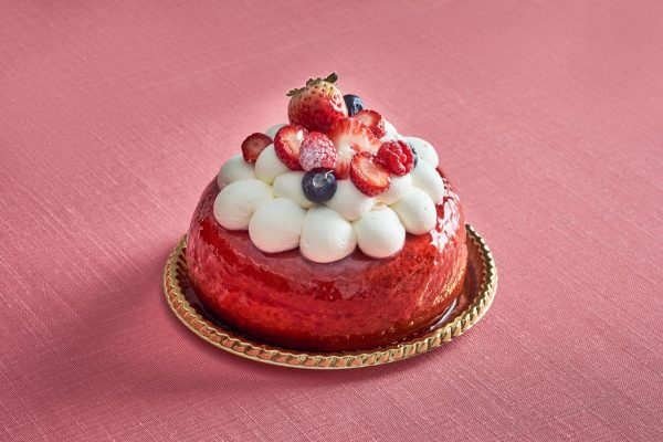 アーモンドが香るスポンジに、爽やかなカシスの風味をプラス。中にはいちごのパルフェとフランボワーズのジュレを重ね、仕上げにライチのムースをのせました。ムースのやさしい口どけと、甘みと酸味のバランスが絶妙な味わいです。 |